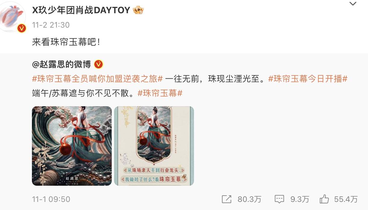 至于宣传力度,光看主演的“摇人”成果,《珠帘玉幕》仍能以数量取胜。开播后,赵露思疑似发动了圈内好友、网红达人,纷纷为新剧宣传,名单包括但不限于肖战、鹿晗、周也、王安宇、李维嘉、匪我思存、周雨彤、张大大、韩安冉等等。虞书欣的《永夜星河》,则有檀健次、张凌赫、奚梦瑶、金靖、全红婵、鞠婧祎、刘雨昕、杨超越等助阵。