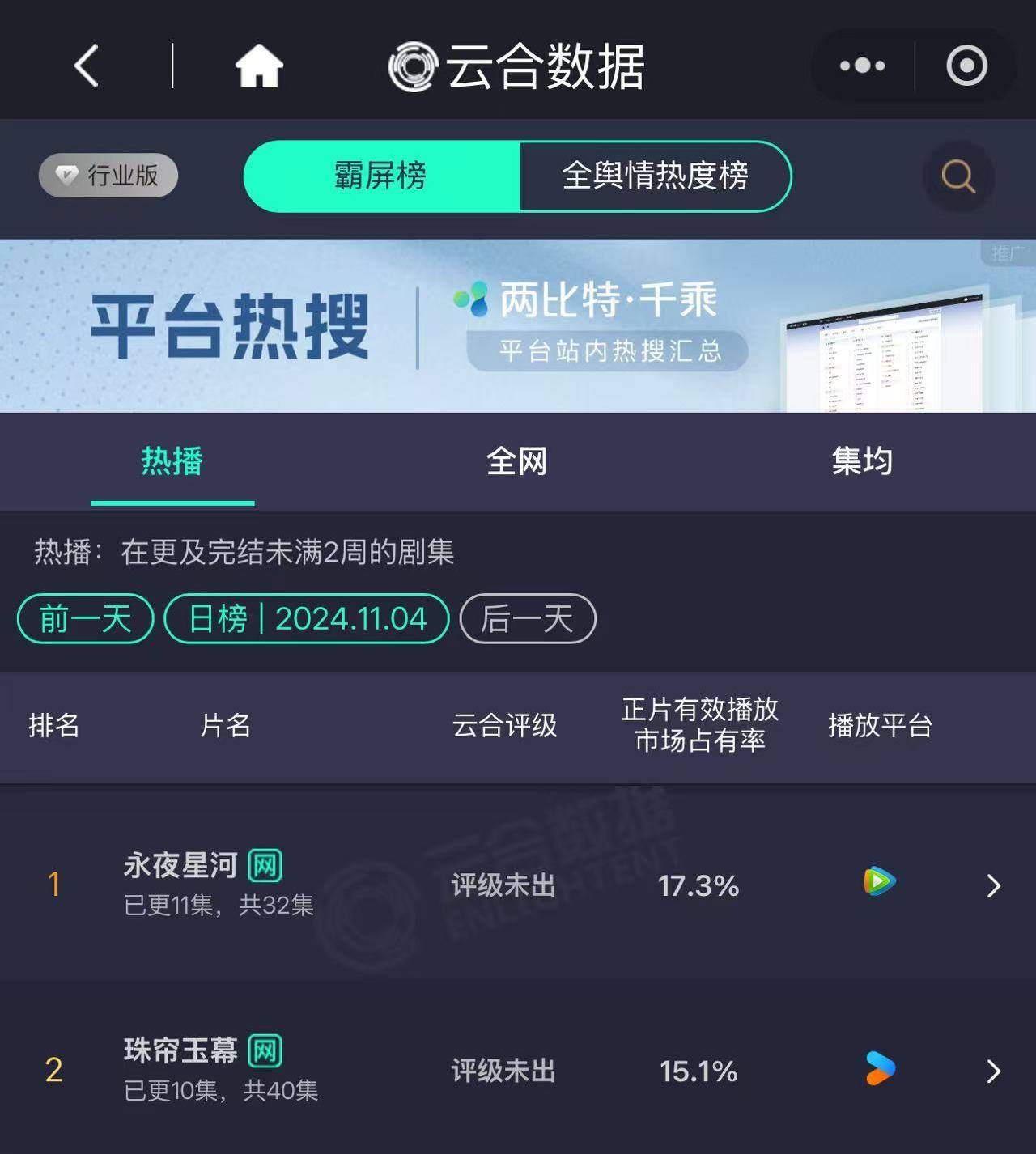 而根据11月4日新鲜出炉的云合数据,《永夜星河》占比 17.3%,预估播放量在4000万左右;《珠帘玉幕》占比 15.1%,预估播放量3500万。