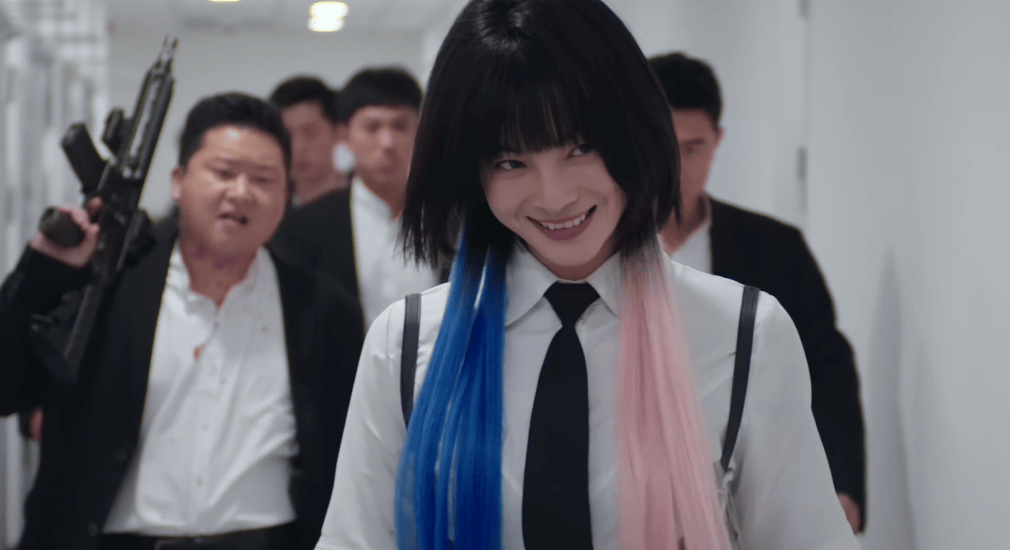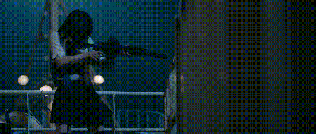 船上有个反派精英怪, 杨杏饰演的娜娜,是个端着枪含着棒棒糖蹦蹦跳跳的暴走萝莉。