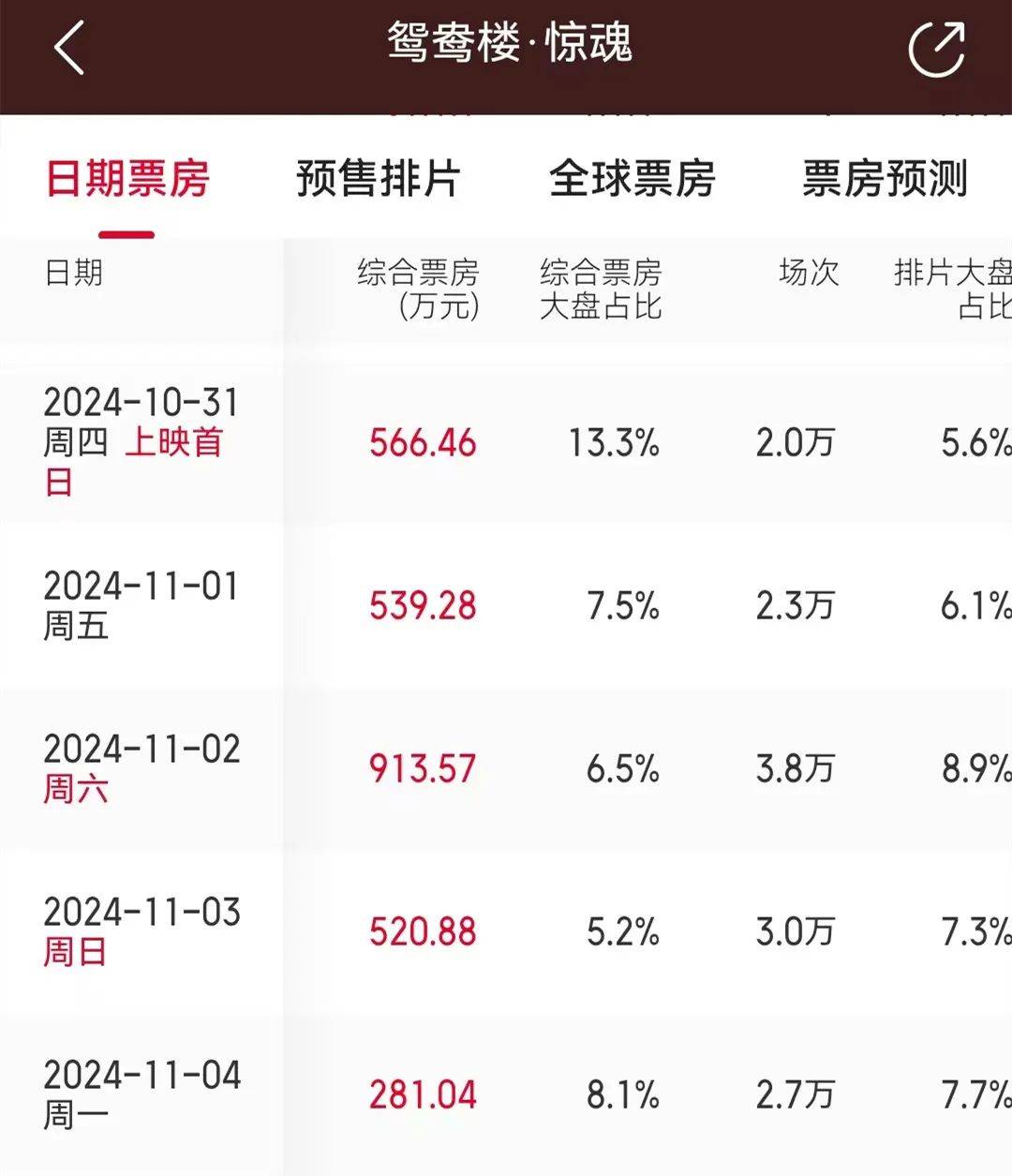 这部影片于10月31日(周四)上映。虽然是工作日,但当天为西方文化里的“万圣夜”。它借此“天时”斩获566万人民币票房。次日万圣节当天,作为恐怖片的唯一选择,本片再次斩获539万票房。
