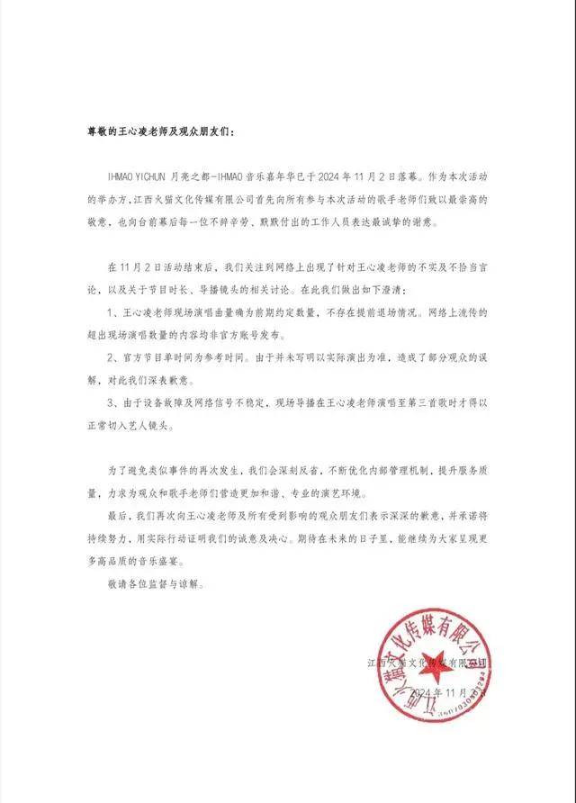对此,主办方IHM音乐嘉年华官方发布声明称,王心凌现场演唱曲量确为前期约定数量,不存在提前退场情况,官方节目单时间为参考时间。由于并未写明以实际演出为准,造成了部分观众的误解。此外,由于设备故障及网络信号不稳定,导致王心凌演唱至第三首歌时才得以正常切入艺人镜头。