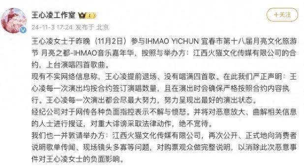 11月3日,王心凌工作室发布声明称,“王心凌女士于昨晚(11月2日)参与IHMAO YICHUN 宜春市第十八届月亮文化旅游节 月亮之都-IHMAO音乐嘉年华,按照与举办方:江西火猫文化传媒有限公司的合约,上台演唱四首歌曲。现有不实网络信息称,王心凌提前退场、没有唱满四首歌。在此我们严正声明:王心凌每一次演出均按合约签订演唱数量,且在演出时会确保严格按照合约内容执行。”