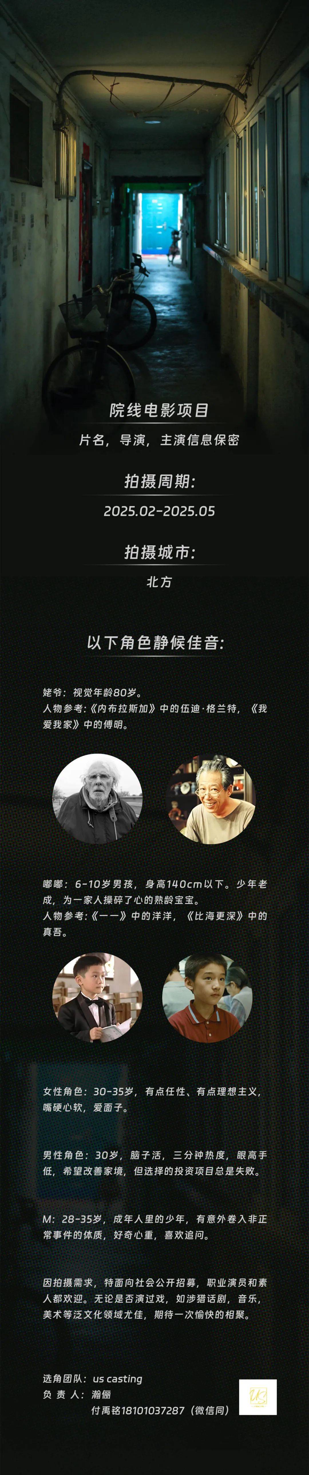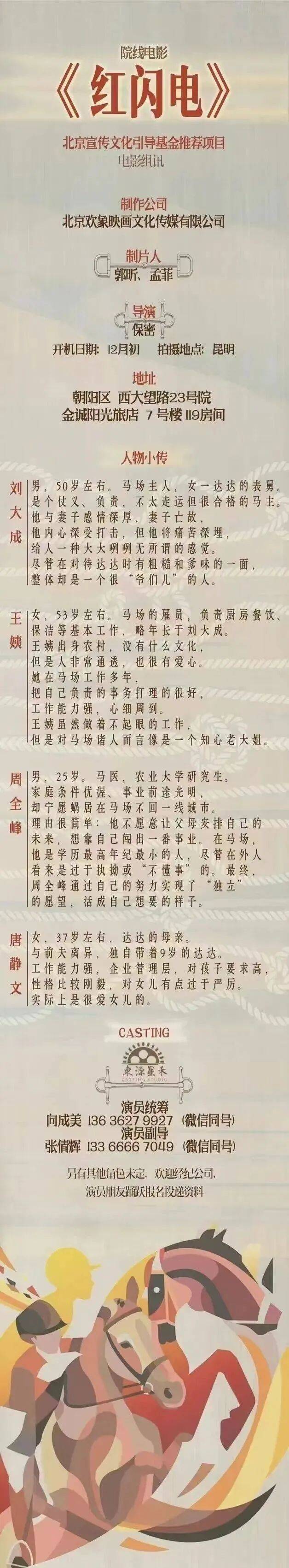 免责声明:戏客Seeker公众号(“本平台”)中全网组讯的信息、内容(“组讯信息”,包括但不限于影视项目名称、项目介绍信息、出品公司信息、导演信息、选角团队信息、拍摄相关信息、联系方式等)均来源于内容信息相关方提供或互联网公开信息。本平台不对组讯信息的真实性、准确性、完整性、及时性、关联性、适用性及安全性提供任何明示或默示的担保。请您谨慎参考或使用组讯信息,并确保您的人身、财产安全,本平台不对您使用或参考组讯信息而造成的后果承担任何责任。