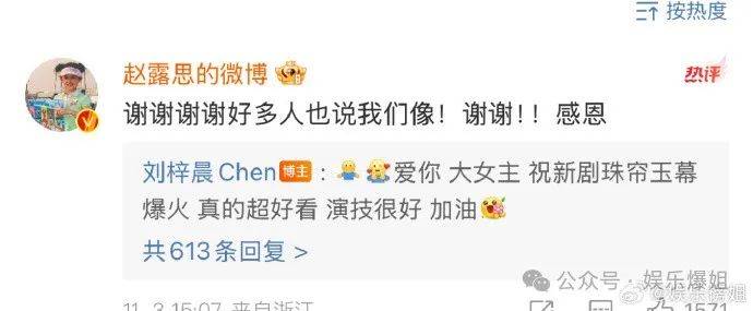 事件简述:一个口碑很差的网红刘梓宸发状态推荐大家去看《珠帘玉幕》,赵露思就去评论区感谢了他,还回应了网友说他们俩长得像的恶评;