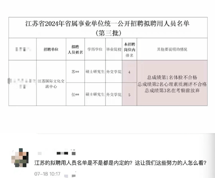 正观新闻消息,近日,随着“江苏省2024年省属事业单位统一公开招聘拟聘用人员名单公示(第三批)”的公布,其中有网友对江苏国际文化交流中心“对外联络(岗位编号017)”岗位的录取结果提出质疑,并发帖表示,是否存在内定情况?