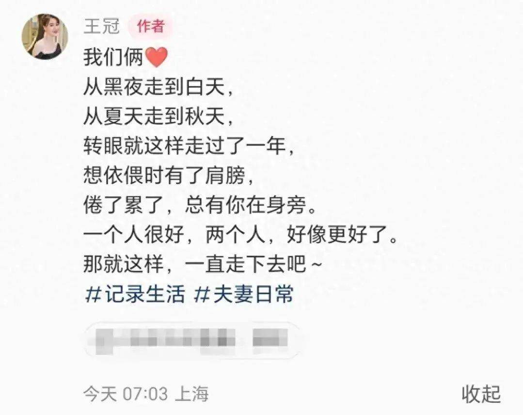 10月31日,主持人王冠通过个人社交账号公开了婚讯。她写道:我们俩,从黑夜走到白天,从夏天走到秋天,转眼就这样走过了一年,想依偎时有了肩膀,倦了累了,总有你在身旁。一个人很好,两个人,好像更好了。那就这样,一直走下去吧~
