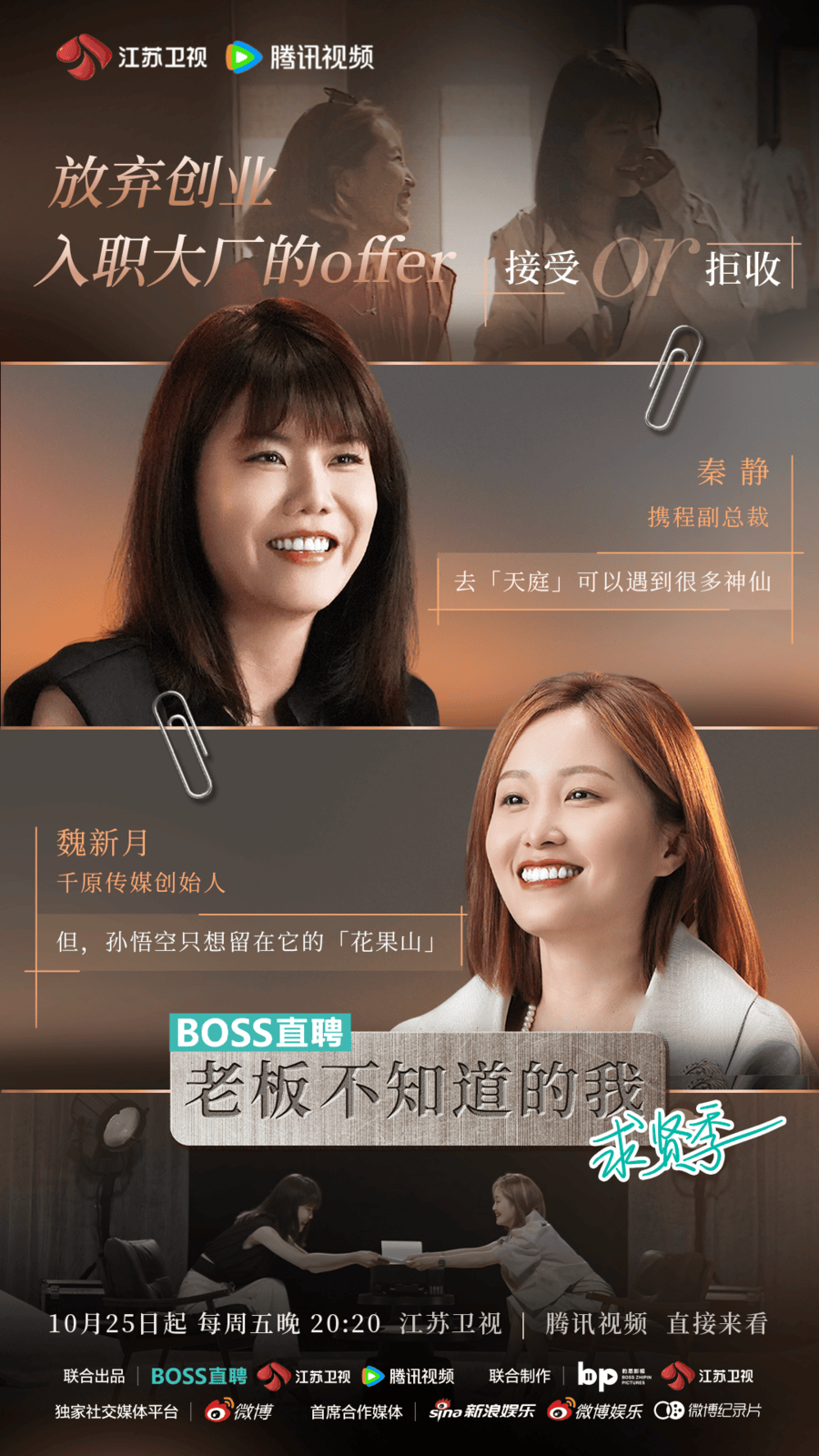 10 月 25 日起,每周五晚 20:20 锁定江苏卫视和腾讯视频,观看《老板不知道的我・求贤季》。这一次,换老板跟我直接谈!