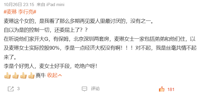 估计节目播到现在,麦麦知道自己口碑变成这样之后,还会责怪李行亮呢。