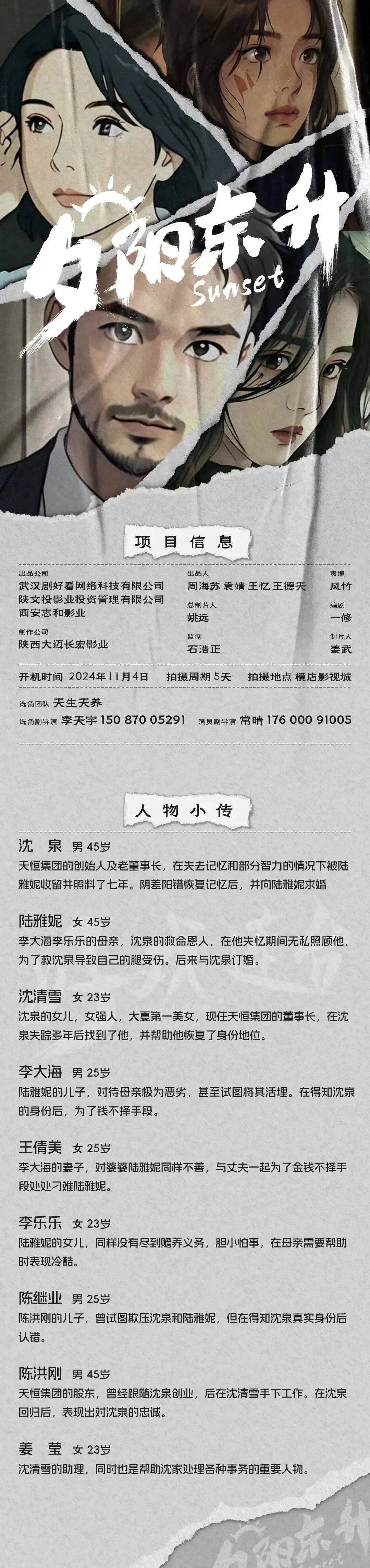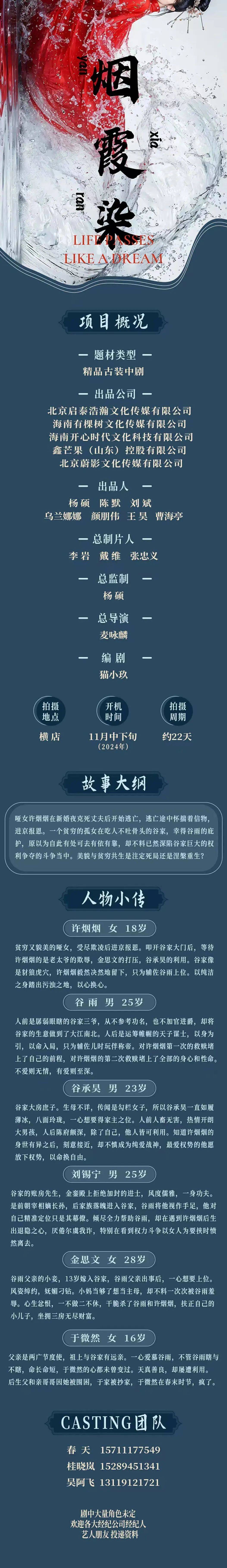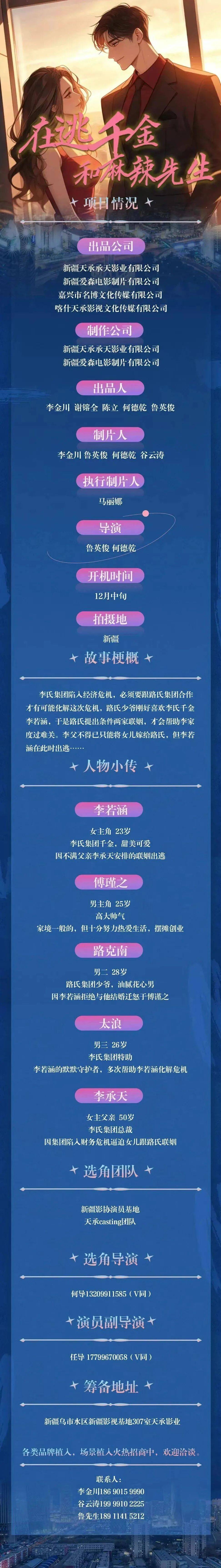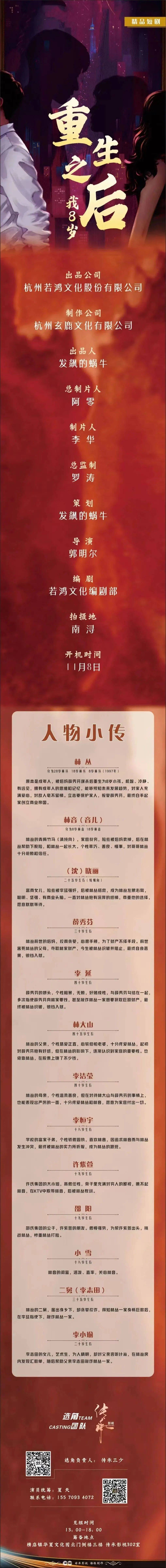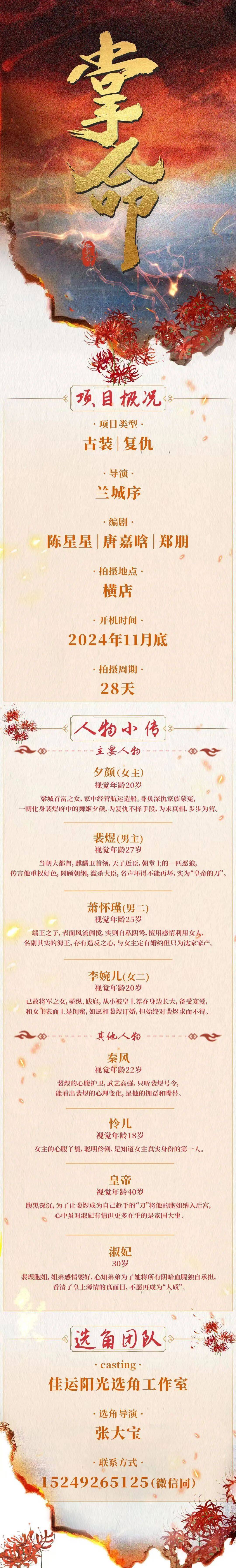 剧中大量角色未定,欢迎各大经纪公司和演员朋友投递资料。