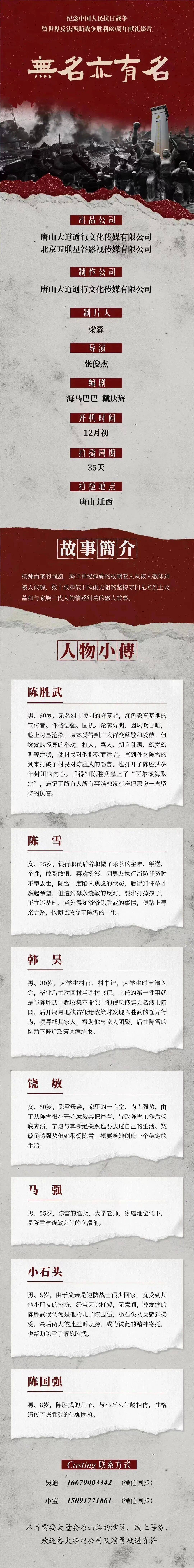 本片需要大量会唐山话的演员,线上筹备,欢迎各大经纪公司及演员投递资料。