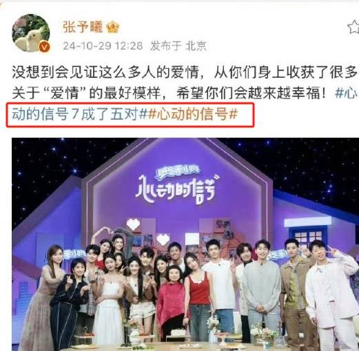 或许是因为太过于激动,作为观察嘉宾的张予曦居然提前哈珀泄露了《心动7》的结局,虽然之后秒删,但是依旧逃不过观众的火眼金睛。张予曦这次除了放出收官返场大合照,还带了“心动7成了5对”的词条,确认本季12位素人成了5对,除去压根没参加告白夜的刘雨璠,只能是李定豪和赵牧辰两人中间有一人落败了。