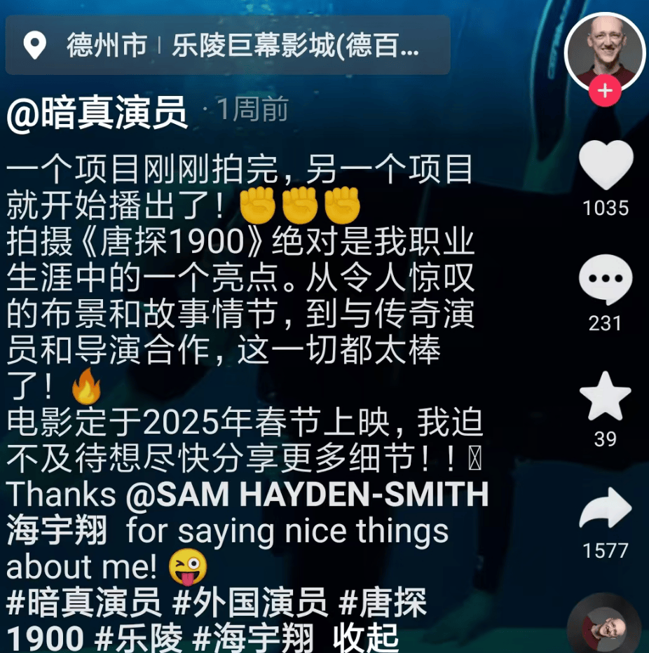 他参演了这部电影,并且在杀青之后发布了一则短视频,还在视频里对这部电影大夸特夸,大力称赞电影的布景和情节。