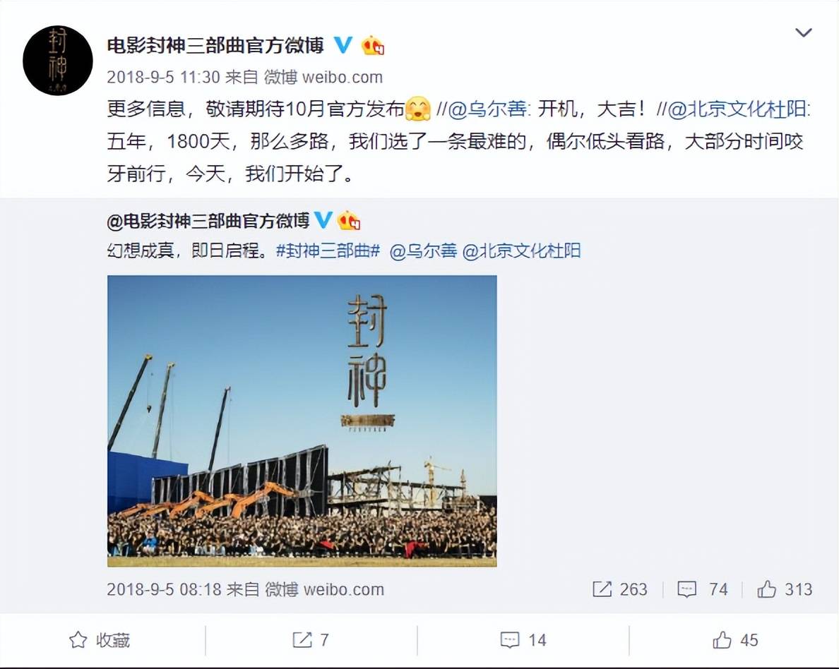 早在2014年,乌尔善就开始构思《封神三部曲》,经过长达4年的筹备,2018年9月5日正式在青岛东方影都开机,当时制片人杜杨说“五年,1800天,那么多路,我们选了一条最难的,偶尔低头看路,大部分时间咬牙前行,今天,我们开始了。”这意味着从一开始,就确定了三部曲将由北京文化主投,开拍前就已经筹备了五年的时间。