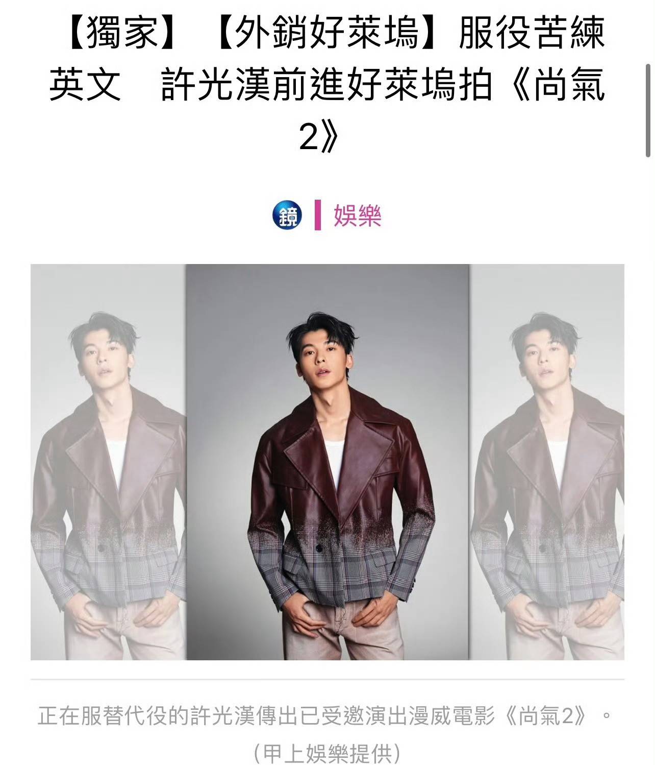 搜狐娱乐讯 近日,据台媒报道,许光汉已受邀参演漫威电影《尚气2》,将与好莱坞华裔男星刘思慕合作,目前兵役期间在苦练英文,预计明年8月退伍后将进组拍摄。 据悉,许光汉凭电视剧《想见你》名气大增,海外邀约增多,在日本、韩国等多部剧集作品中均有出演。