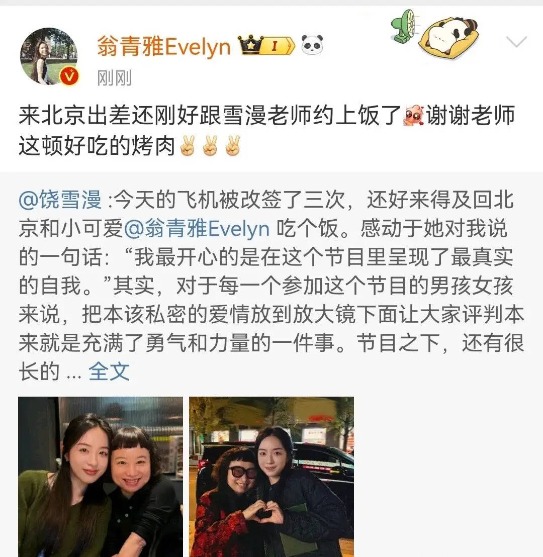 搜狐娱乐讯 近日,饶雪漫与恋综嘉宾翁青雅吃饭被偶遇,在网上引起热议。随后,饶雪漫大方晒出两人聚餐合照,并配文:“今天的飞机被改签了三次,还好来得及回北京和小可爱翁青雅吃个饭。感动于她对我说的一句话:'我最开心的是在这个节目里呈现了最真实的自我'其实,对于每一个参加这个节目的男孩女孩来说,把本该私密的爱情放到放大镜下面让大家评判本来就是充满了勇气和力量的一件事。节目之下,还有很长的属于自己的人生路要走,但我相信勇敢的人先享受爱,懂爱的人会一直拥有爱。”