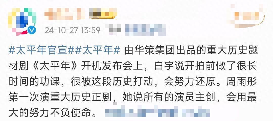 一片舆论声中,10月27日,周雨彤合作白宇、朱亚文主演的《太平年》低调开机,周雨彤直言会用最大的努力,不负使命。