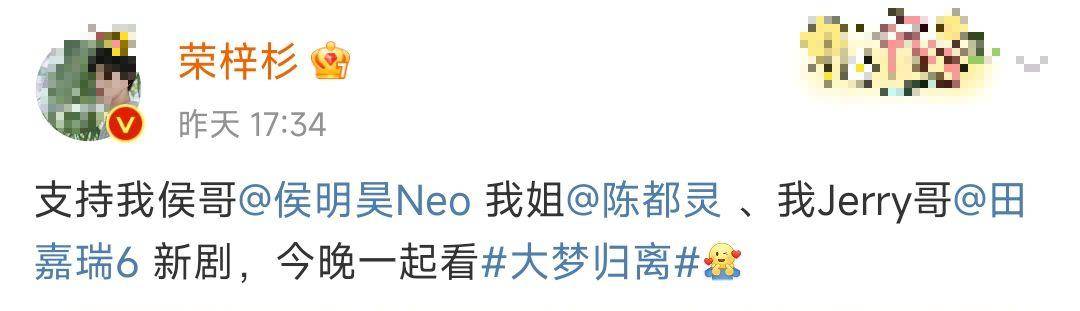 与周雨彤的低调不同,10月26日,侯明昊新剧《大梦归离》火速开播,荣梓杉、金晨接连在社交平台上为他打call,不谈花少的旅行经历,他们依旧情谊深厚。