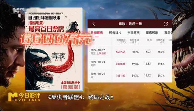 毒液“超高”人气在上映首日就收获超6600万元票房,创下了2019年谢幕以来超英电影单日票房纪录,上映两天票房破亿。
