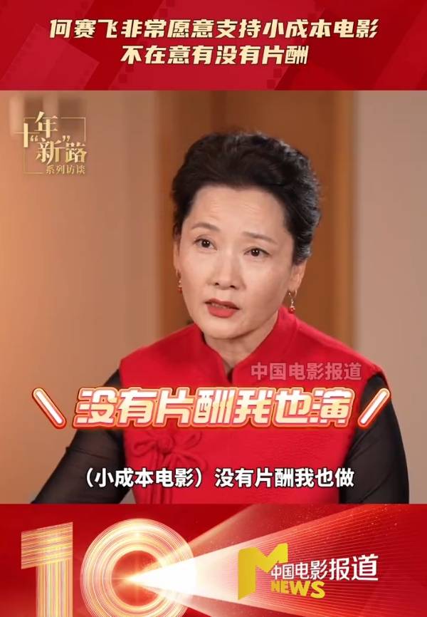 搜狐娱乐讯 近日,演员何赛飞做客《中国电影报道》十年“新”路系列访谈节目,她说非常愿意支持小成本电影,“没有片酬我也演”。她透露接下来还将加盟一部小成本的电影,讲述人与人之间爱的故事。
