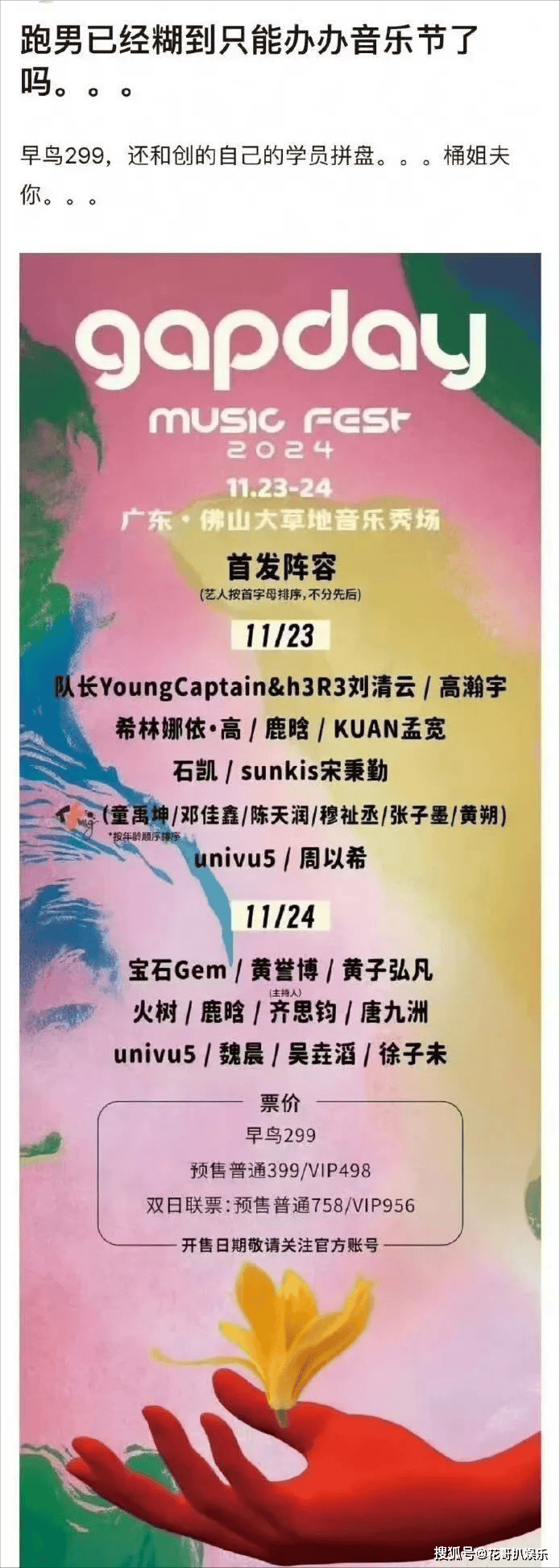 究其原因,是这次并不是演唱会,而是一个拼盘音乐会,翻看一下嘉宾列表,也就一个鹿晗算得上有点知名度,这个音乐节的早鸟票价仅为299元,这个价格放在鹿晗顶流的时候,坐在山顶听他演唱会的门票都买不到,相比他昔日的顶流身份,这样的待遇显得有些不尽如人意。与一群糊咖艺人同台,显得鹿晗也像个糊咖了。