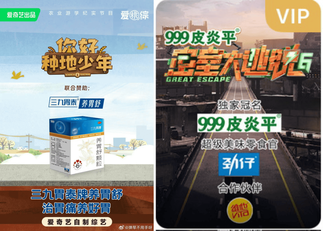 药企品牌也是如此,上半年三九药业品牌(如999感冒灵、999皮炎平、三九胃泰等)投放了《南来北往》《狐妖小红娘·月红篇》等多达20多部剧集。而下半年,三九药业旗下品牌几乎从热剧里消失,反而我们在综艺领域看到了由三九胃泰赞助的《种地吧2》、由999皮炎平独家冠名的《密室大逃脱6》以及由999小儿感冒药冠名的《爸爸当家3》等。