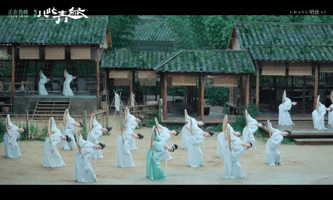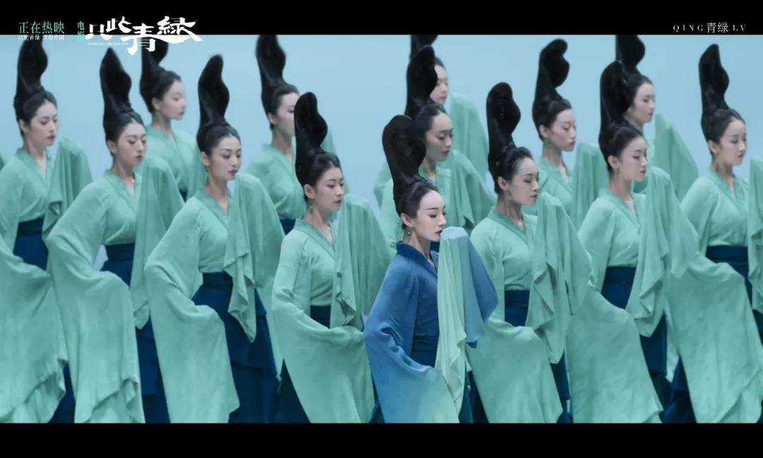 《只此青绿》的故事来自宋代名画《千里江山图》的创作历程——这幅长12米的青绿山水画卷,色彩艳丽,意境悠远,是中国山水画的集大成者。围绕这幅画,舞剧《只此青绿》创造性地打造出一个跨越多重时空的唯美故事,并提取了画卷中的青绿色彩,并赋予其人性特征,以中国古典群舞的形式幻化出灵动瑰丽的“千里江山”。“美”一定是这部舞剧带给观众的主要视觉关键词,而电影化之后,它的美也被镜头放大。