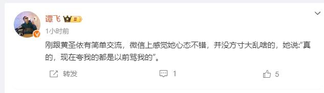 搜狐娱乐讯 10月25日,策划人谭飞在个人社交账号发文爆料,称自己刚和黄圣依聊过,并表示对方心态目前不错,称黄圣依坦言:现在夸我的都是以前骂我的。