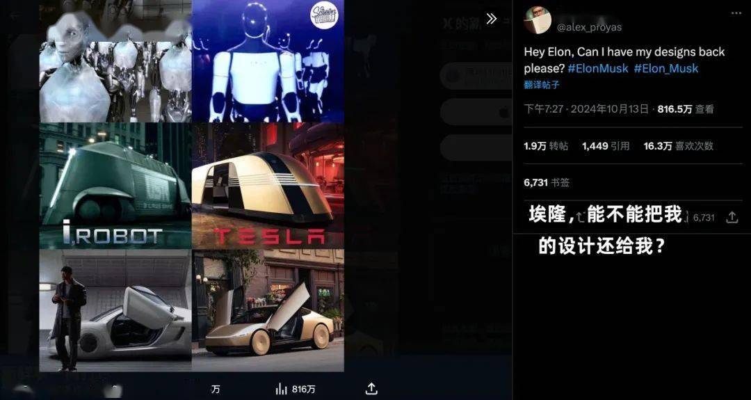 特斯拉无人驾驶出租车发布会的名称 “我们,机器人”(We, Robot),是对电影原著艾萨克・阿西莫夫短篇小说集标题的改编,导演亚历克斯在X上发文要求马斯克归还他的设计:“埃隆,能不能把我的设计还给我?”