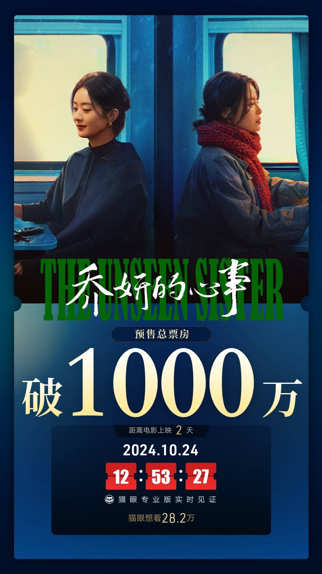 搜狐娱乐讯 据猫眼专业版数据,截至10月24日12:53,赵德胤执导,赵丽颖、辛芷蕾领衔主演,黄觉特邀主演,董宝石特别出演的电影《乔妍的心事》映前2天,点映及预售总票房破1000万。