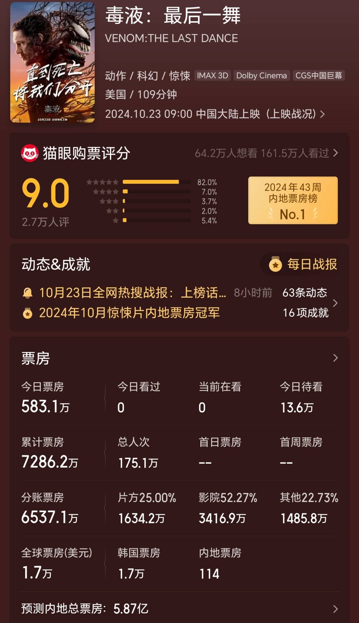 该系列第一部《毒液:致命守护者》在中国大卖18.7亿美元,第二部未在中国上映,第三部按开局,猫眼专业版预测其最终总票房可能冲6亿元。