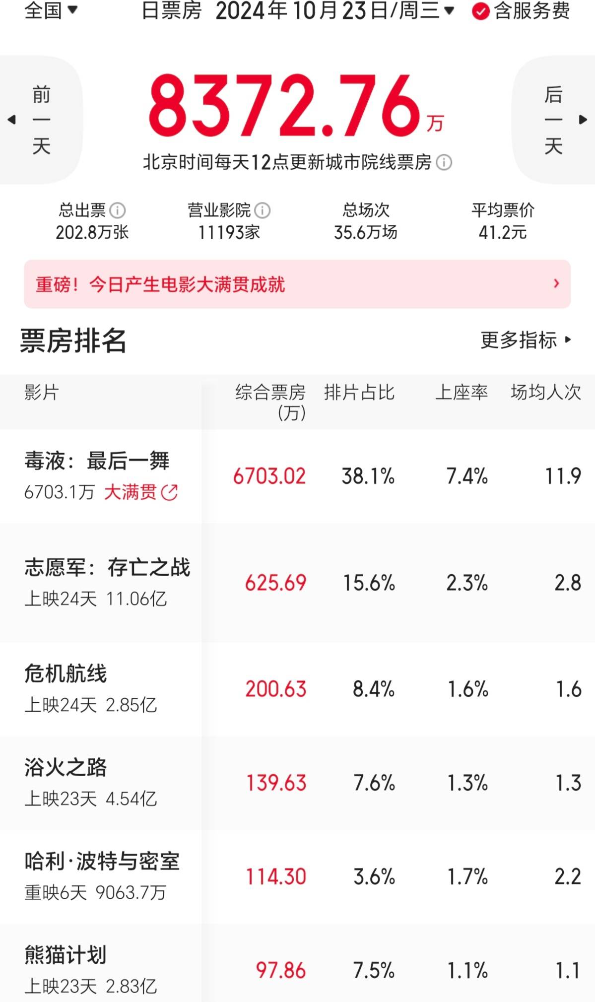 搜狐娱乐讯 (哈麦/文)8月23日(周三),好莱坞大片《毒液:最后一舞》提前北美两天在中国上映,首日排片占比超38%,收票房6700万元,在周三工作日的首日成绩在今年的好莱坞电影中仅次于《哥斯拉大战金刚2》,比周五上映的《死侍3》高出20%左右。