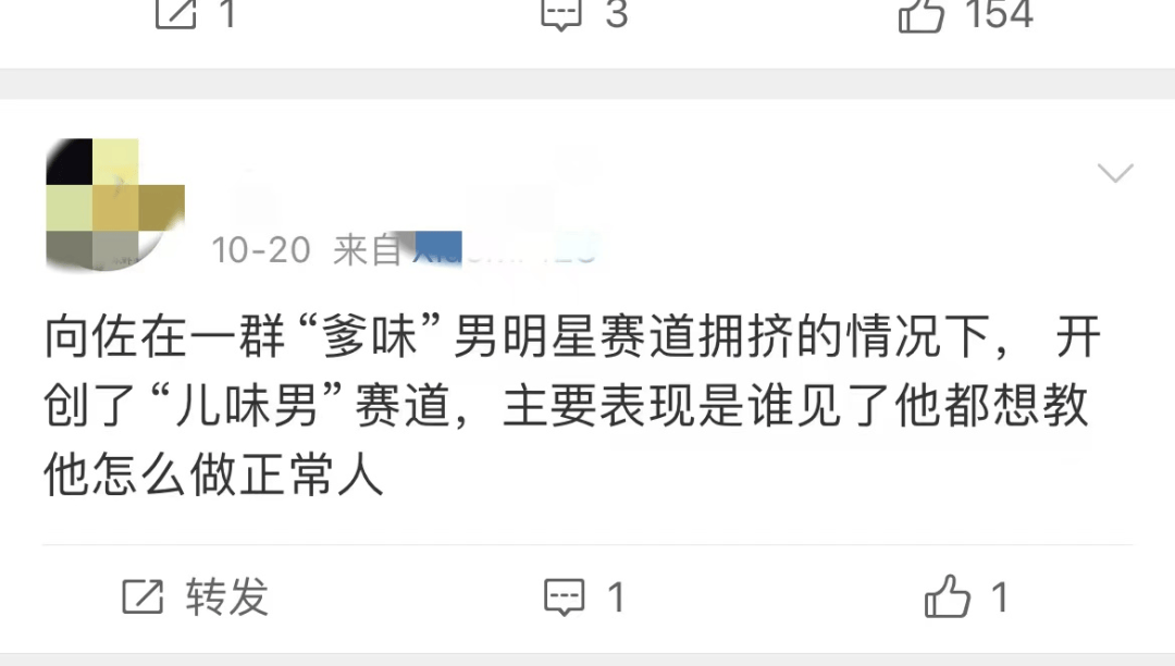 有人说:“向佐在一群爹味男明星赛道拥挤的情况下,开创了‘儿味男’赛道,主要表现是谁见了他都想教他怎么做正常人。”