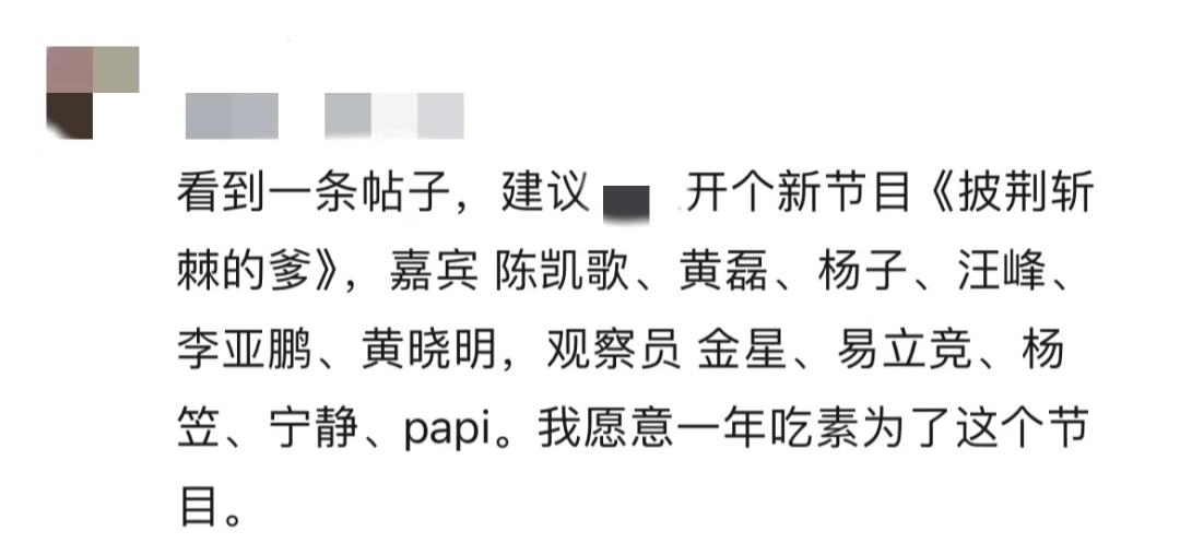 面对这些爹味男明星,网友们直接重拳出击,“建议开一档新的综艺节目,就叫《懂王争爸赛》,嘉宾邀请黄磊、杨子、黄晓明、汪峰等人,再请金星、易立竞、杨笠、宁静、PAPI酱做观察嘉宾,肯定很精彩”。