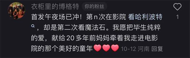网友“衣柜里的博格特”留言表示,自己“首发午夜场已冲,第N次在电影院看哈利·波特,但却是第二次看《魔法石》。我愿把毕生纯粹的爱,献给20多年前妈妈牵着我走进电影院的那个美好童年。”