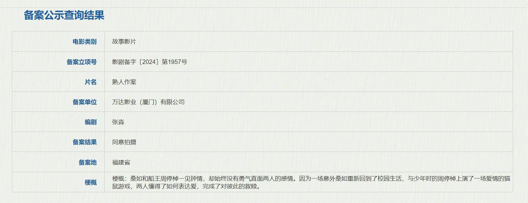 1905电影网讯近日,国家电影局发布关于2024年9月上全国电影剧本(梗概)备案、立项公示的通知,根据在言外同名小说改编的电影《熟人作案》立项,编剧为张淼,备案单位为万达影业(厦门)有限公司。