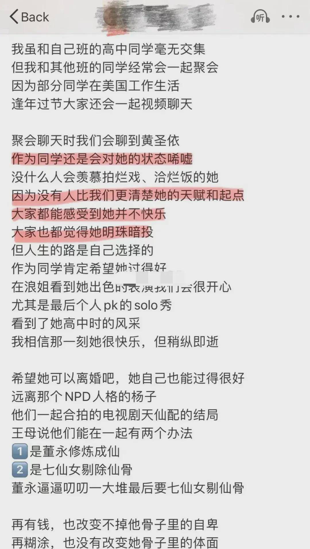 还有黄圣依的高中同学,看了《再见爱人4》之后非常压抑,觉得黄圣依不该过成这样,热议发文力挺她。