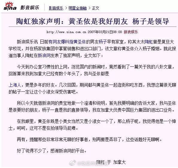 杨子前妻陶虹曾发声明:我和黄圣依是好友