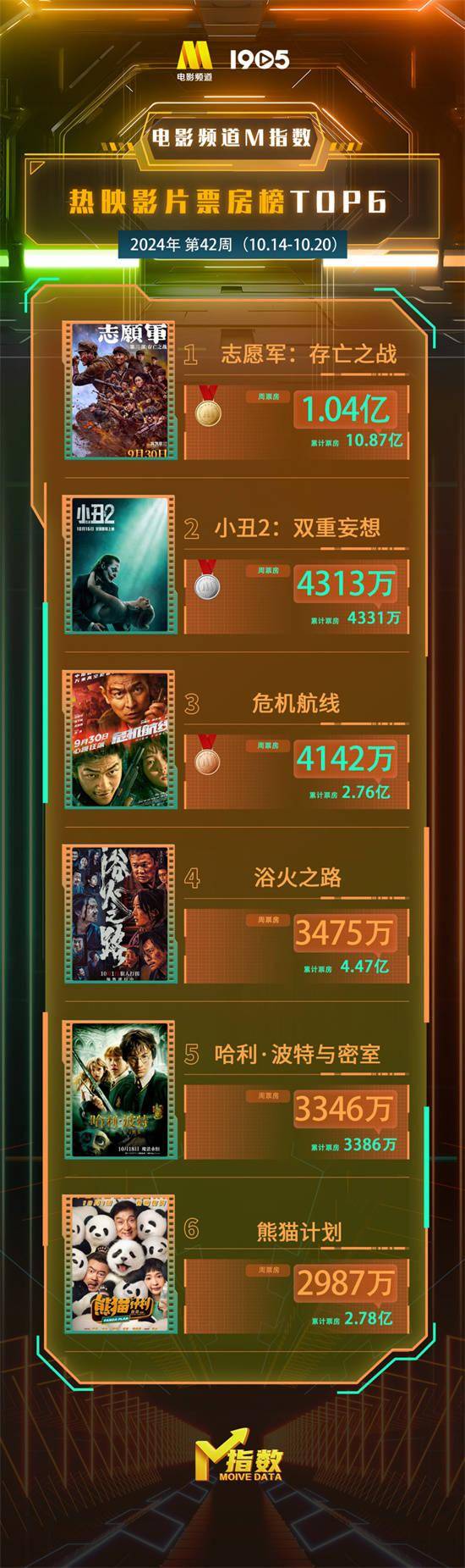 1905电影网讯 近日,电影频道M指数2024年第42周结果新鲜发布。10月14日-10月20日,“电影频道M指数”热映影片票房榜前6位依次为: