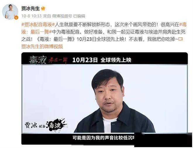 贾冰自己也在微博上回应称:“人生就是要不断解锁新形态,这次来个画风带劲的!很高兴在《毒液:最后一舞》中为毒液配音。”