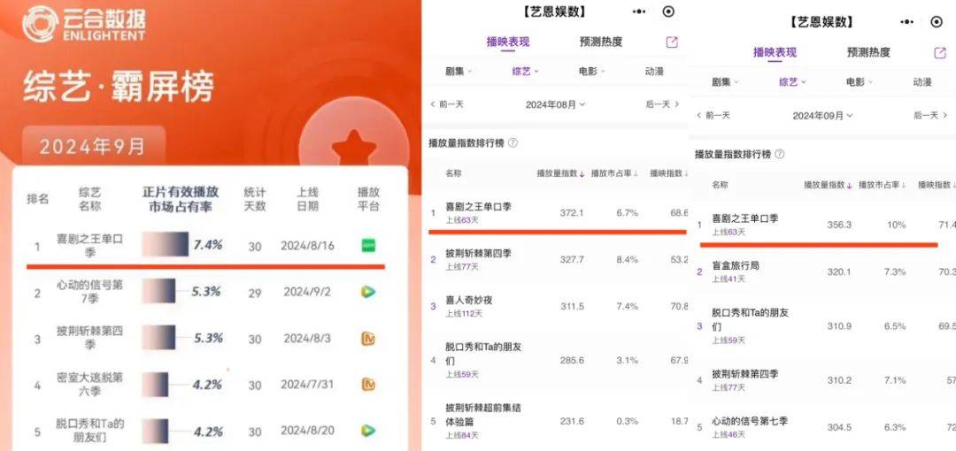 就拿播映热度来说,霸屏三个月的《喜单》屠榜了各大第三方数据网站,云合数据显示,节目揽得连续8周周榜TOP1(8.19-10.13)和九月综艺霸屏榜TOP1,而隔壁的《脱口秀和Ta的朋友们》只屈居第五;且据艺恩娱数统计,《喜单》连续6周拿下综艺榜周榜TOP1(2024年33周-38周)并登顶了八九两月的月榜TOP1,而另一边《脱友》仅排在第4位和第3位。