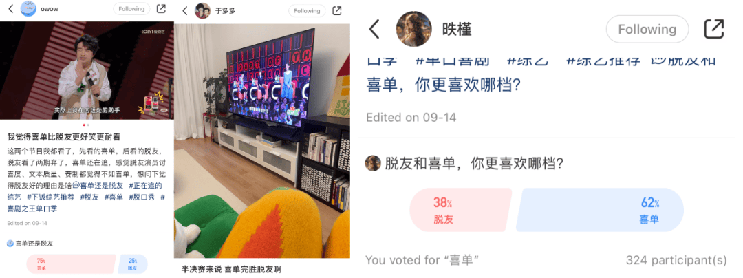反观小红书平台,各路观众repo认为《喜单》观感好于《脱友》的笔记占了绝大多数,比如博主「owow」发布了笔记《我觉得喜单比脱友更好看更耐看》,博主「于多多」则认为《半决赛来说,喜单完胜脱友》,而在博主「昳槿」人气笔记《脱友和喜单pk,你更喜欢哪档?》发起的一项投票中,324位参与者有62%的人把票投给了《喜单》。