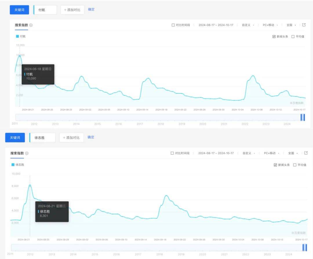 再是助推演员方面,百度搜索指数显示,两档节目热播期间(8月17日-10月17日)关键词“付航”10090的搜索峰值也超越了隔壁人气最高的“徐志胜”(8301搜索峰值),这凸显了《喜单》有效推人的节目价值。
