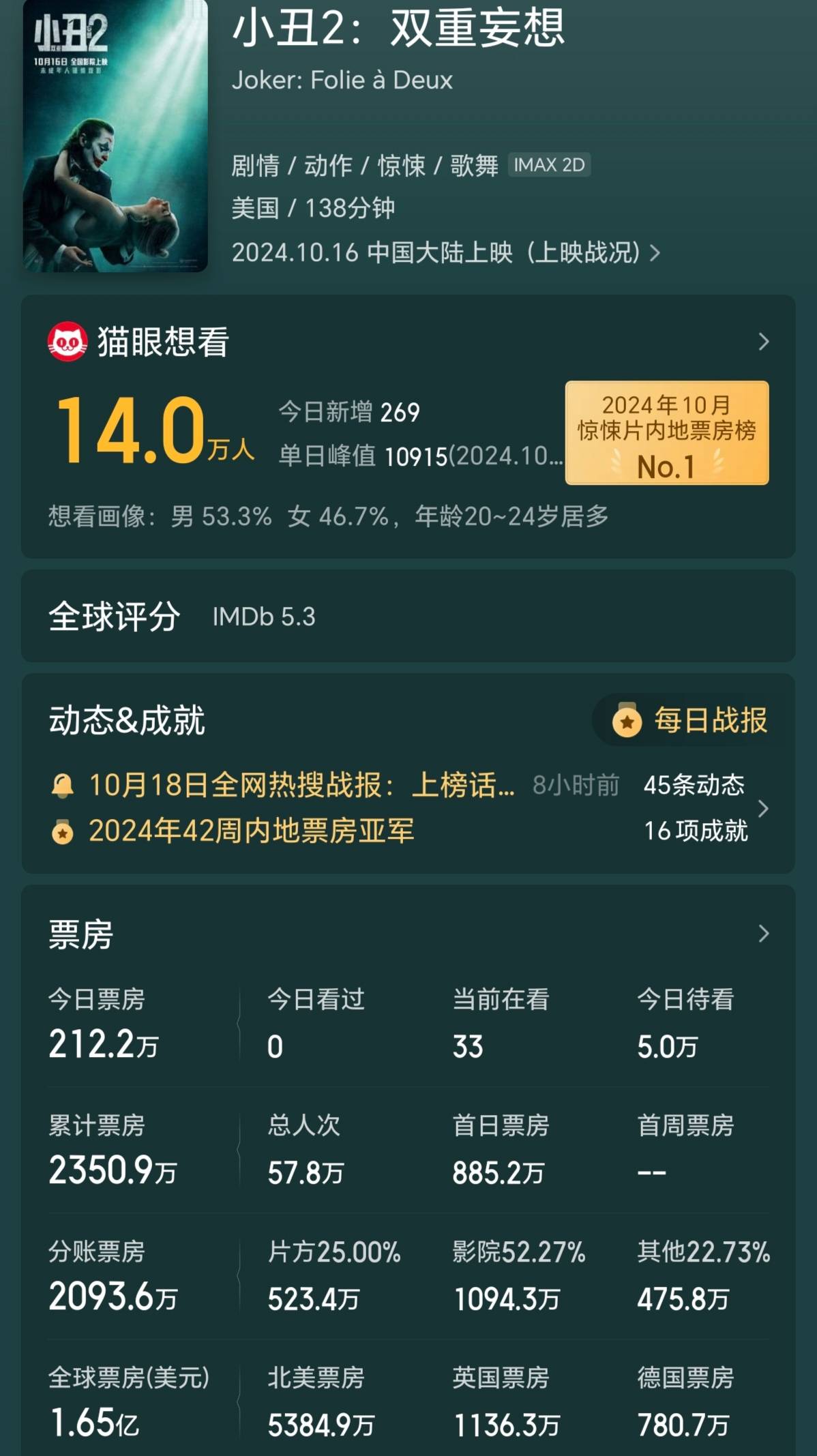 《小丑2:双重妄想》10月16日上映,三天票房分别为885万元、530万元、662万元,累计2139万元,第三天排片占比16.1%,上座率只有2.1%,垫底。猫眼专业版预测其最终总票房可能落在6600万元。