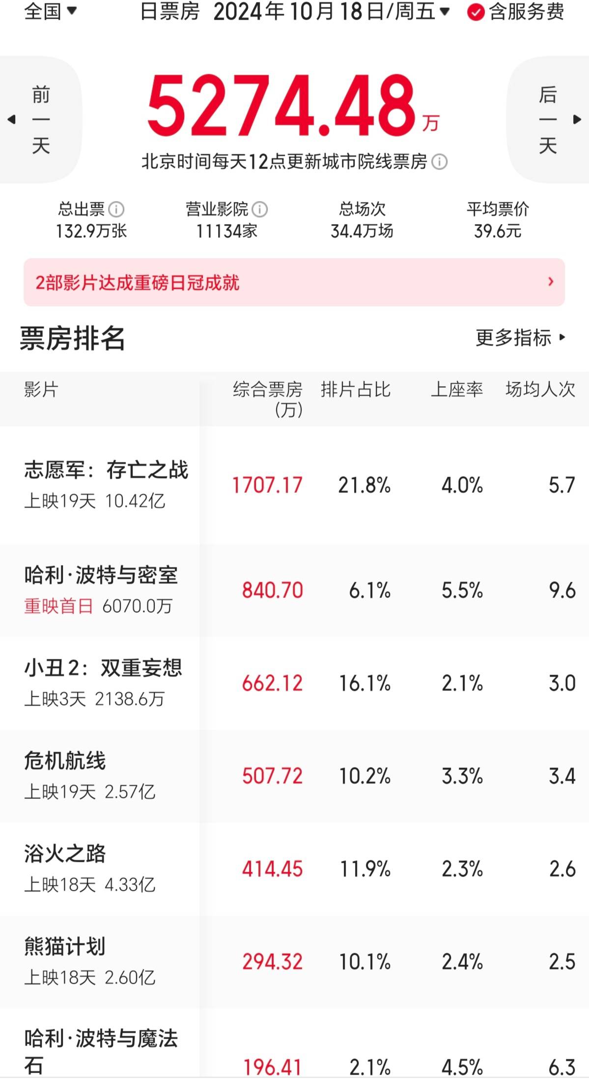《哈利波特与密室》首日上座率5.5%,是当日电影里最高的,高过《志愿军2》的4.0%和《小丑2》的2.1%。