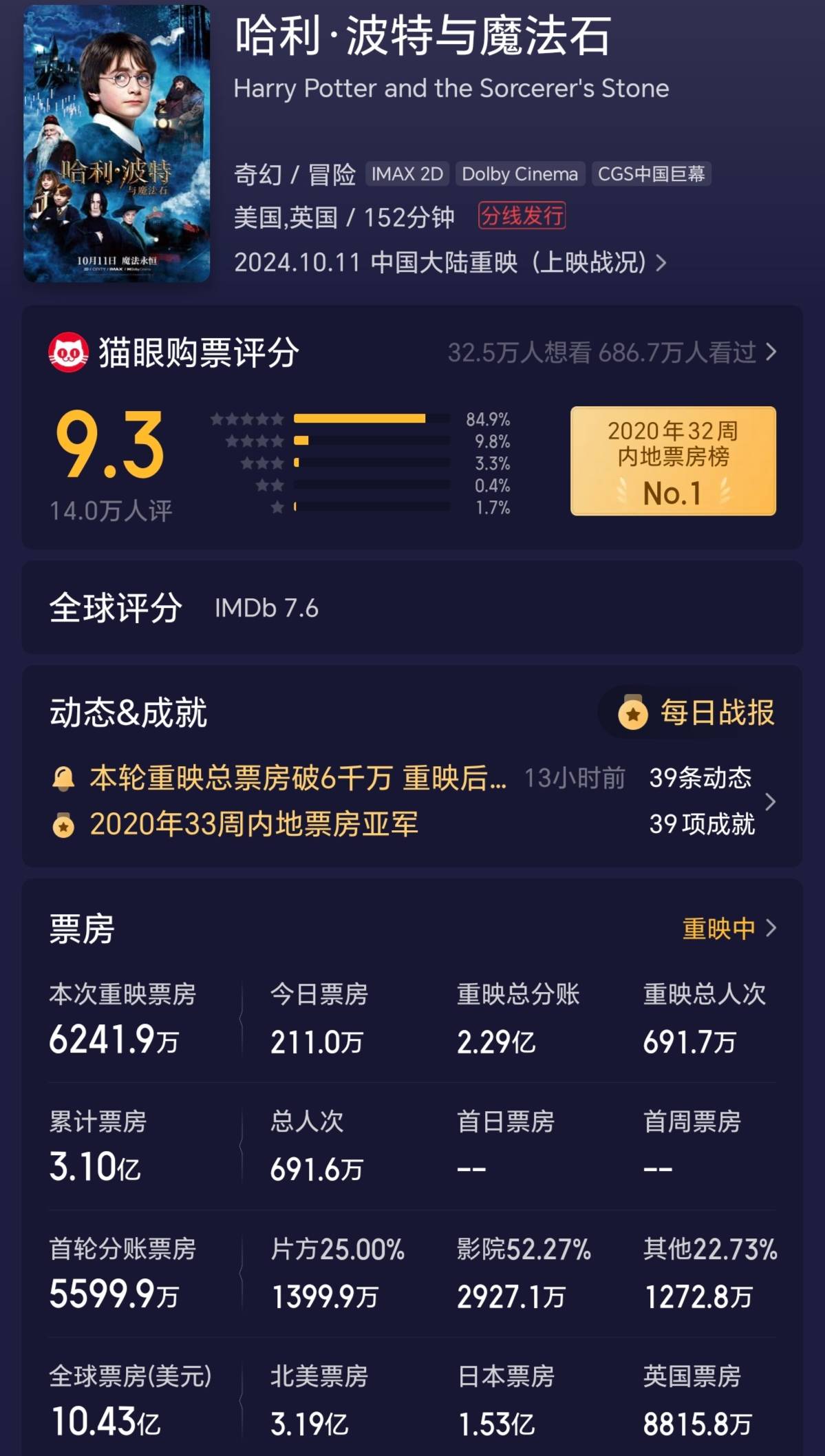 《哈利波特与魔法石》复映八天累计票房6242万元,它曾于2002年1月上映时票房5600万元,2020年8月复映时票房1.92亿元,三次上映累计票房过了3.1亿元。