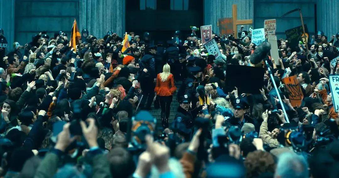 同时,莉的高调行事让她和小丑都暴露在媒体的聚光灯下,享受着来自支持他们群众的疯狂拥簇。追随者在押送亚瑟的车旁高喊“小丑无罪”,监狱里的疯子狱友们为他而高呼,莉为自己画上了小丑的妆容进入陪审团旁听审判,而此时,小丑状态下的亚瑟仿佛一个哥谭的明星。