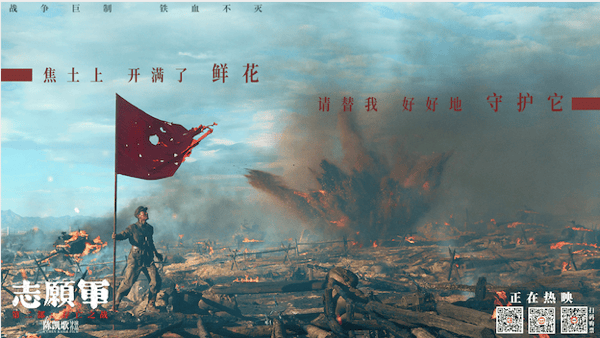 影片中,浑身是伤,步履蹒跚的李想,誓死守护着国旗。当看到志愿军战士在满目疮痍的战场废墟之上插上旗杆,让布满弹孔的五星红旗随风招展的那一瞬间,谁能不涌起热血与热泪——战场上,有国旗的地方,就有志愿军坚毅的身影。人在,旗在,阵地在,红旗不倒,信仰永存。