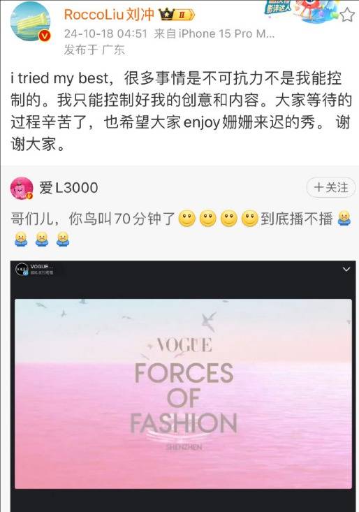 搜狐越来讯 10月18日凌晨,《VOGUE》主编刘冲为时尚活动的直播迟到发文道歉,他写道:“i tried my best,很多事情是不可抗力不是我能控制的。我只能控制好我的创意和内容。大家等待的过程辛苦了,也希望大家enjoy姗姗来迟的秀。 谢谢大家。”据悉,此次活动是他晋升为《VOGUE》主编后首次主办的活动。
