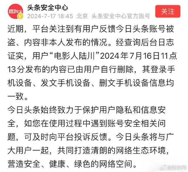接着,头条安全中心发文回应陆川账号被盗:等于是揭发陆川自己删除的,打了他的脸!