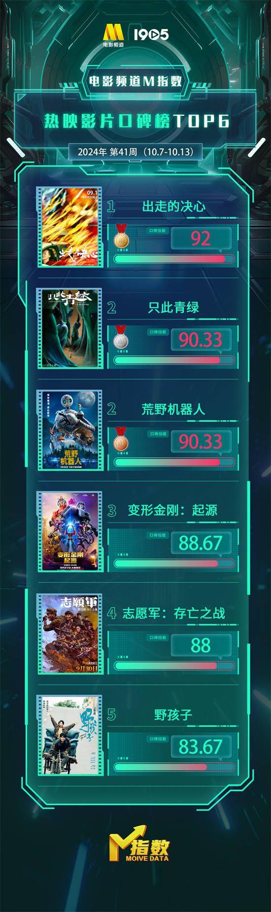 “电影频道M指数”热映影片口碑榜前6位依次为: